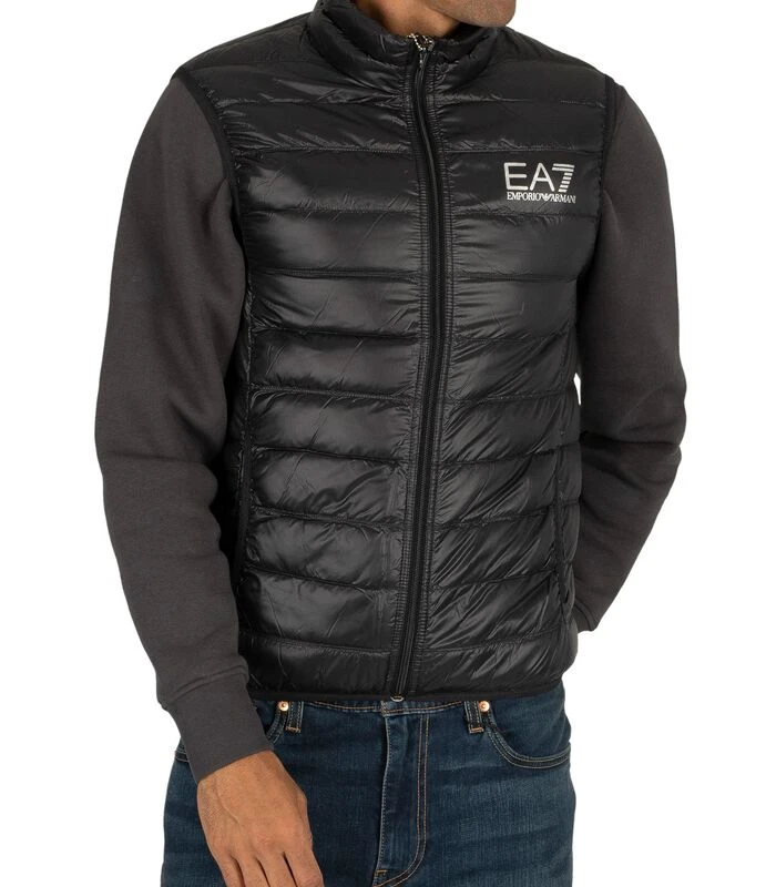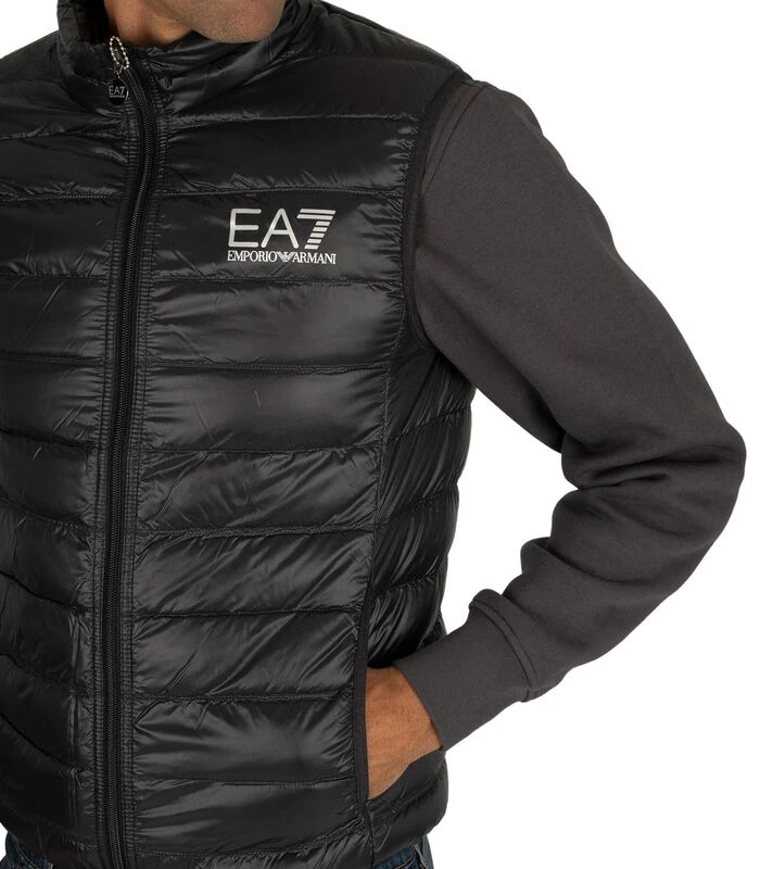 De donsjack van EA7 wordt geleverd met een opgedrukt logo op de borst, inclusief een tas met merknaam om in te pakken. Deze gilet in zwarte kleur heeft open zakken en elastische zoom.