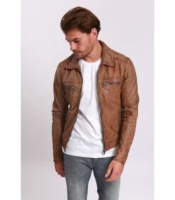 Leren jack met overhemdkraag – Lange manchetten met ritssluiting – 2 zijzakken aan de voorkant – Borstzak met ritssluiting Â