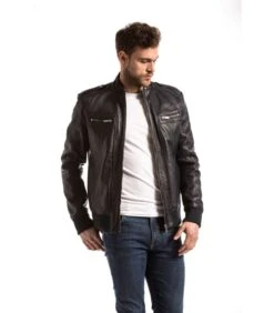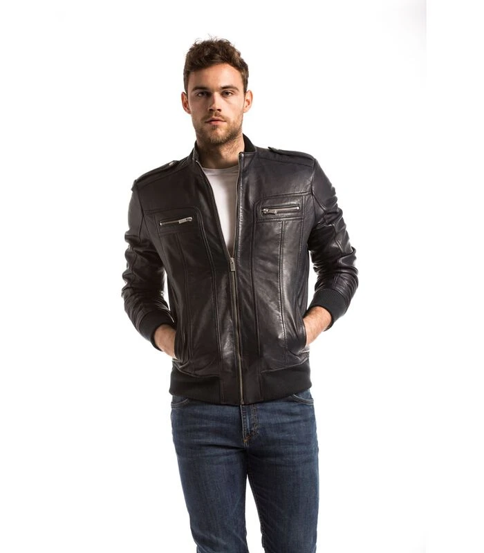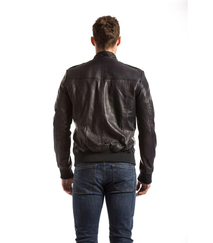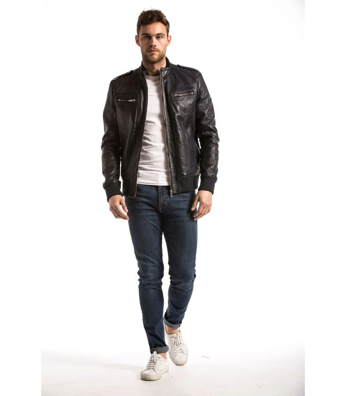 Leren jack met een ronde hals. De mouwen zijn lang en er zijn siernaden. De jas heeft 2 voorzakken met rits. Er zit ook een rits aan de voorkant. Het heeft geribde manchetten, schouderlipjes en een geribde tailleband.  Als u twijfelt tussen 2 maten, neem dan de volgende maat groter.